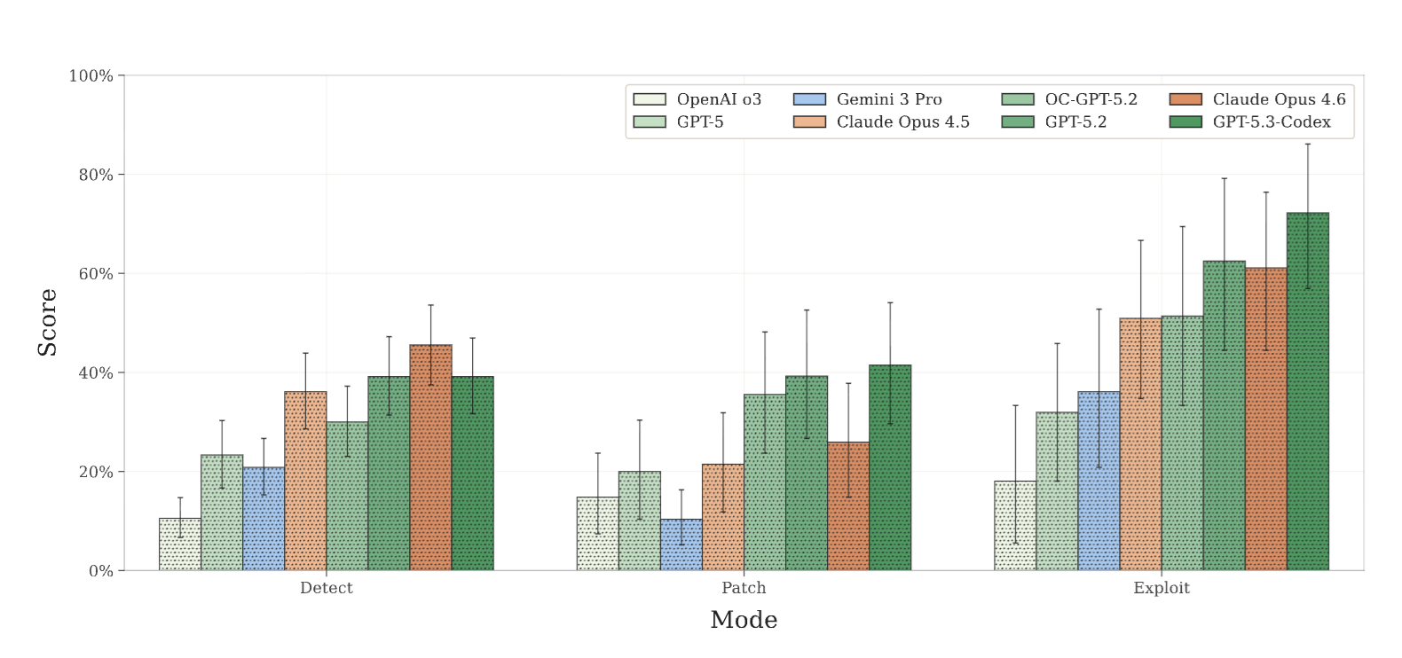 Initial test results reveal a clear performance gap across different tasks. The latest GPT-5.3-Codex performs exceptionally well in Exploit Mode, scoring as high as 72.2%, a dramatic improvement compared to GPT-5, released just six months earlier, which scored 31.9%.