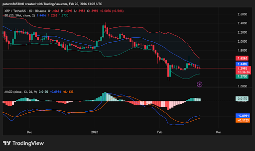 That pattern confirms a bearish market structure on the daily chart. At the time of writing, XRP trades around $1.39, well below its 20-day moving average.