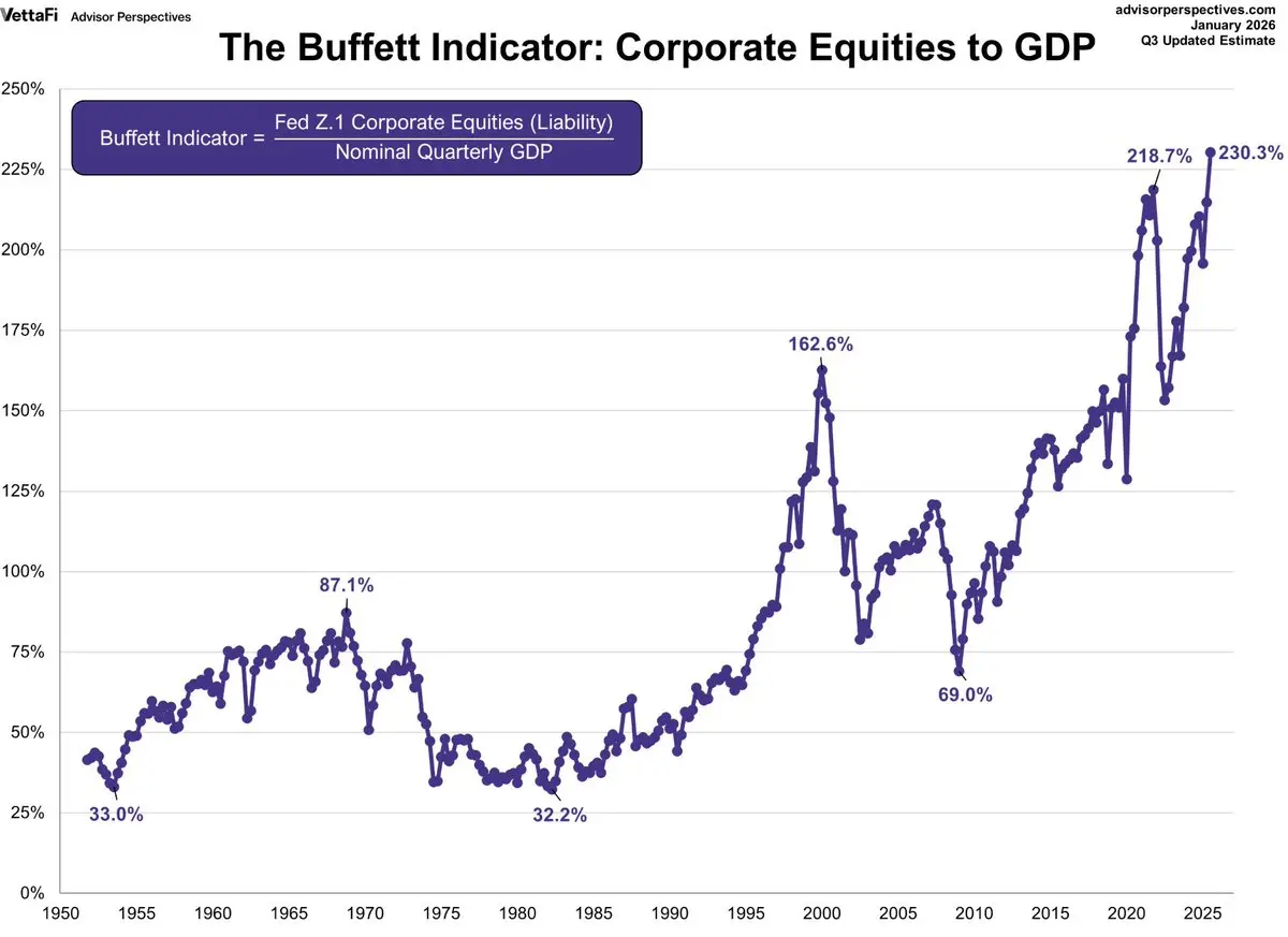 One indicator is the Buffett Indicator, which compares the total market capitalization to GDP. Buffett considers a ratio of 75%-90% reasonable; over 120% or higher is considered seriously overvalued—like playing with fire.