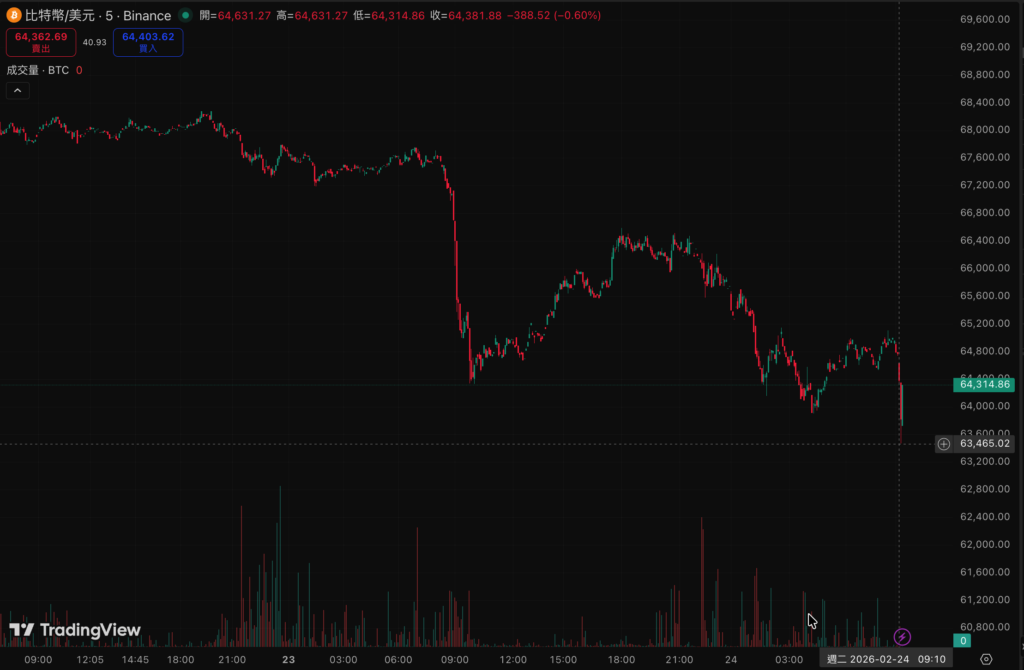 Bitcoin briefly dropped below $64,000 around 4 a.m. today following the sharp decline in U.S. stocks on Monday (2/24) after the market closed, with a low of $63,465. It is currently trading at $64,314. Overall market sentiment remains in a state of “extreme panic,” with the Fear & Greed Index lingering at low levels.