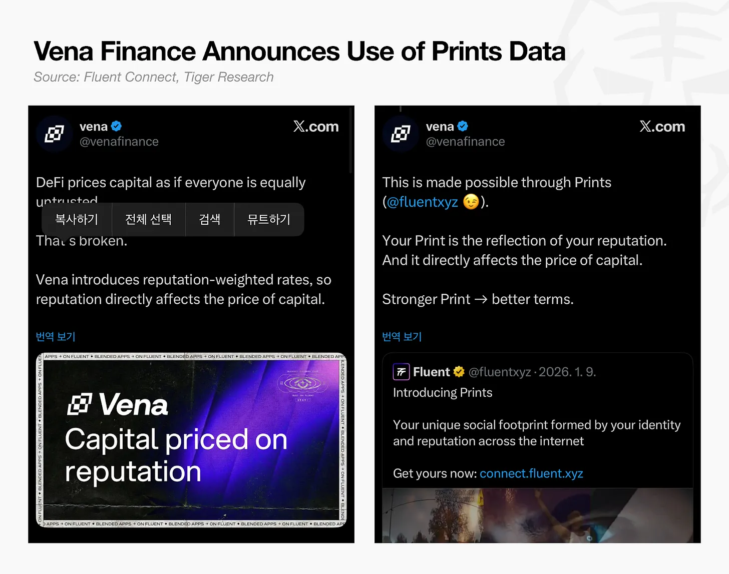 Third-party adoption has already begun. Vena Finance announced it will introduce a reputation-based interest rate mechanism using Prints data, offering better borrowing terms to high-credit users. Since launch, about 40,000 users have registered, and API development for developers is underway.