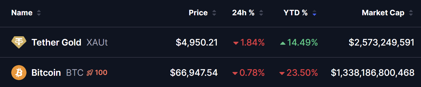 At the same time,** Tether Gold (XAUT)** — the tokenized version backed 1:1 by physical gold — is tracking closely near $4,950, down about 1.84% on the day but still up over 14% year-to-date. Meanwhile, Bitcoin continues to lag around the mid-$60K region, highlighting gold’s relative strength so far in 2026.