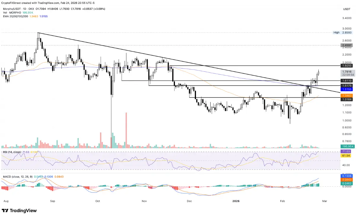 Morpho maintains impressive bullish momentum after successfully breaking above a resistance line on the daily logarithmic chart — connecting two significant peaks formed on 8/22 and 11/13. At the time of writing, Morpho’s price increased by 3% on Wednesday, following a strong 10% recovery from the 200-day exponential moving average (EMA) in the previous session.