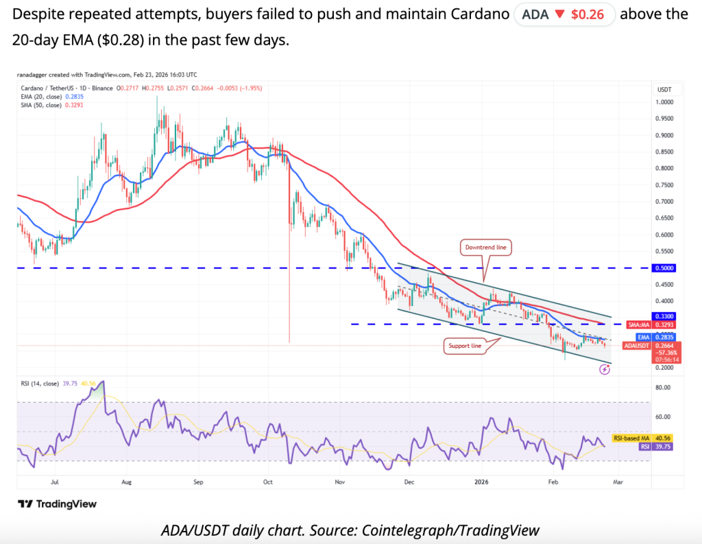 Cardano dipped to around $0.259, caught in the same tariff headwind as everything else. From here, a modest hold near $0.26 this last week of February is plausible, then a potential 41% surge to $0.365 by late March if the macro picture clears.
