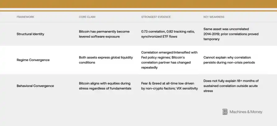The case for permanent reclassification rests on a correlation of 0.73, a 0.82 year-to-date tracking ratio, synchronized ETF flows, and shared institutional investor bases. Under this view, the ETF era has permanently embedded Bitcoin into tech portfolios. Correlation is expected to persist across liquidity cycles.