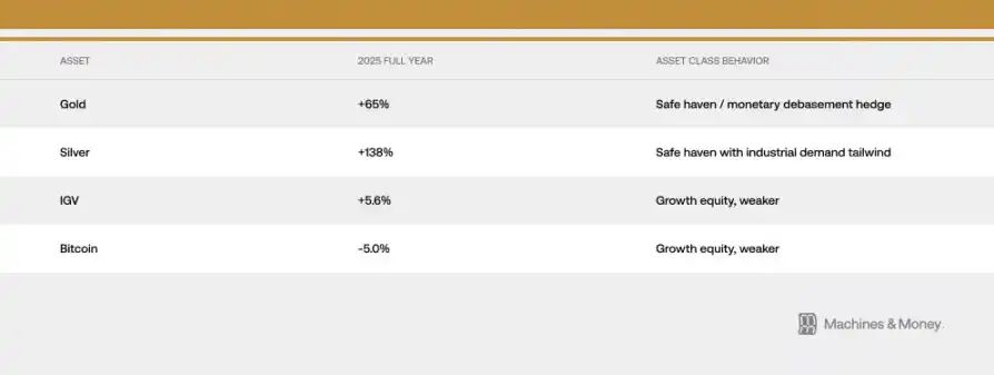 This does not mean Bitcoin will never exhibit safe-haven properties; rather, it indicates that under current investor composition, market structure, and liquidity regimes, it simply cannot. In 2025, both Bitcoin and software stocks delivered low single-digit returns, while traditional hard assets posted generational gains. The overlapping behavior during this stress test is one of the strongest pieces of evidence supporting the “convergence thesis.”