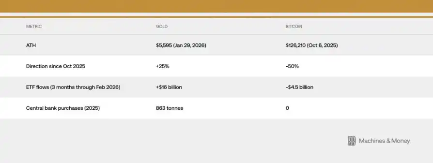 On January 29, 2026, gold hit a record of $5,595. Central banks bought 863 tons of gold in 2025—marking the third consecutive year of large-scale sovereign reserve accumulation. Central banks buying Bitcoin? Zero.