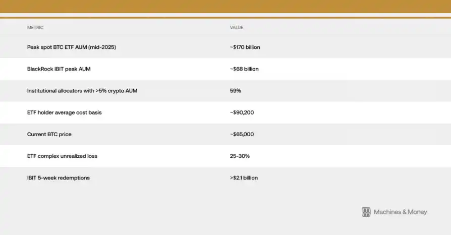 This creates a self-reinforcing correlation loop: institutional classification drives related capital flows, which in turn reinforce classification. According to analysis by Investing.com, the average cost basis for U.S. spot Bitcoin ETF holders is around $90,200. At current prices near $64,000, the entire institutional ETF universe is roughly 25-30% underwater.
