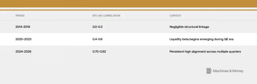 The correlation between Bitcoin and IGV (iShares Expanded Tech Software ETF) has strengthened progressively across three phases.
