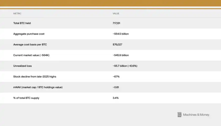 The reflexive loop operates bidirectionally: weak software sector performance drives Strategy’s stock price down, which amplifies Bitcoin bearish sentiment and can even induce actual selling pressure. During corrections, this loop intensified the correlation between Bitcoin and the software index. Since late 2025, Strategy’s stock has fallen about 67% from its high, underperforming IGV and Bitcoin itself.