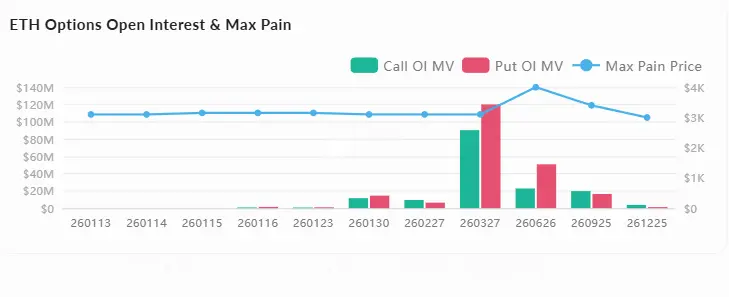 • $3,100-$3,150: Max pain zone for options and concentrated short liquidations, with an open interest of about $130 million