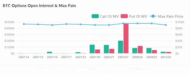 Max pain point: $90,000-95,000 (near expiry contracts). Current price above max pain, indicating put options dominance; if price remains stable, bias remains bullish.