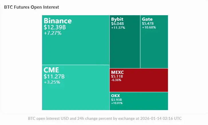 Bitcoin continues its strong momentum on January 14, with technicals confirming an uptrend across multiple timeframes. However, RSI on 1-hour and 4-hour charts exceeds 75, indicating short-term overbought conditions. Derivatives open interest has increased by 6.6%, supporting bullish sentiment, but positive funding rates and leverage crowding raise correction risks. On-chain data shows persistent net outflows, supporting medium-term bullishness, with whale accumulation and institutional buying providing bottom support.
