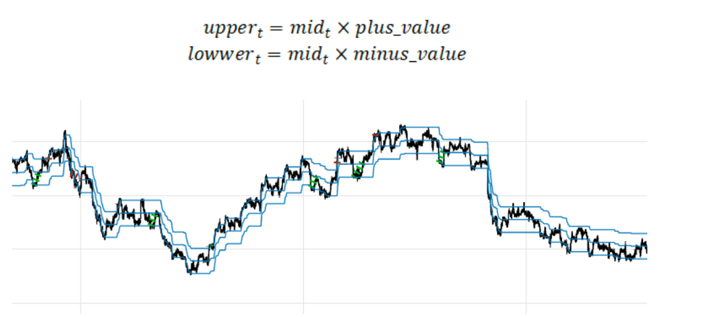 Верхня лінія каналу — це середня лінія каналу, помножена на plus_value; нижня лінія каналу — це середня лінія каналу, помножена на minus_value.
