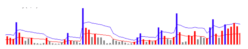 Стовпчики відображають індикатор тренду, синя крива — стандартне відхилення сили тренду, а червона крива — це 0,5 стандартного відхилення. Коли індикатор тренду (стовпчики) вище стандартного відхилення (синя крива), це сигналізує про сильний тренд; коли індикатор тренду вище 0,5 стандартного відхилення (червона крива) — про помірний тренд; коли індикатор тренду нижче 0,5 стандартного відхилення (червона крива), це вказує на боковий ринок.