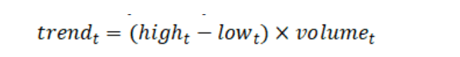 Сила тренду на поточний момент — це різниця між найвищою та найнижчою ціною в цей момент, помножена на обсяг торгів. Зокрема: