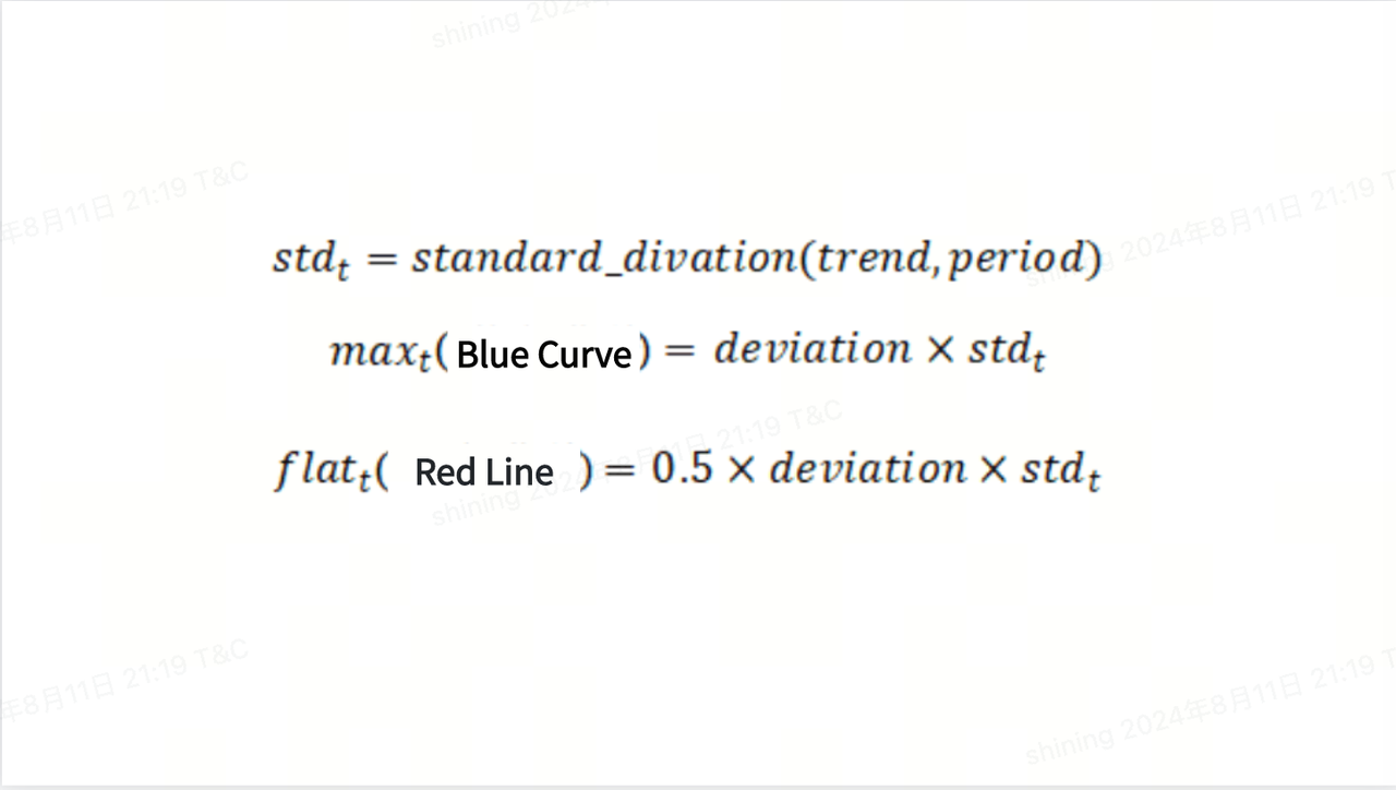 Розрахуйте середнє значення сили тренду за вхідний період, потім обчисліть стандартне відхилення на поточний момент і далі розрахуйте стандартне відхилення сили тренду та 0,5 стандартного відхилення відповідно до вхідного параметра deviation. Зокрема: