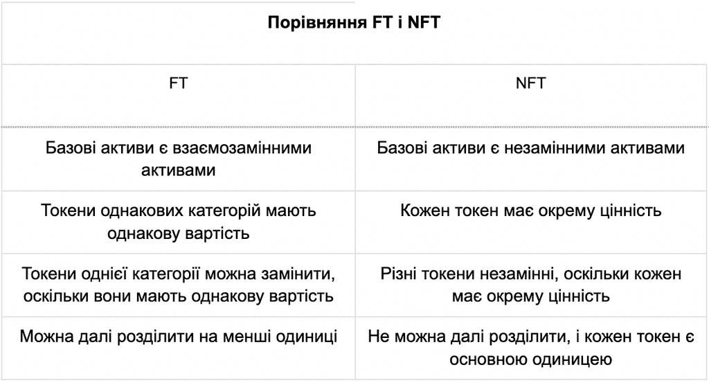 Різниця між NFT і FT (взаємозамінними токенами) полягає в тому, що кожен NFT має власні унікальні атрибути, які відрізняють його від інших NFT. Така унікальність визначає те, що кожен NFT має власну цінність.