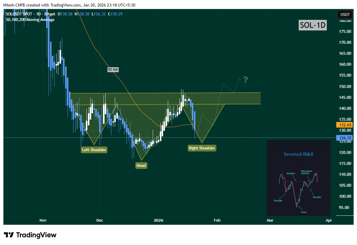 На щоденному таймфреймі Solana, здається, формує можливий інвертований патерн “голова і плечі”, один із найнадійніших структур для розвороту бичачого тренду при підтвердженні.