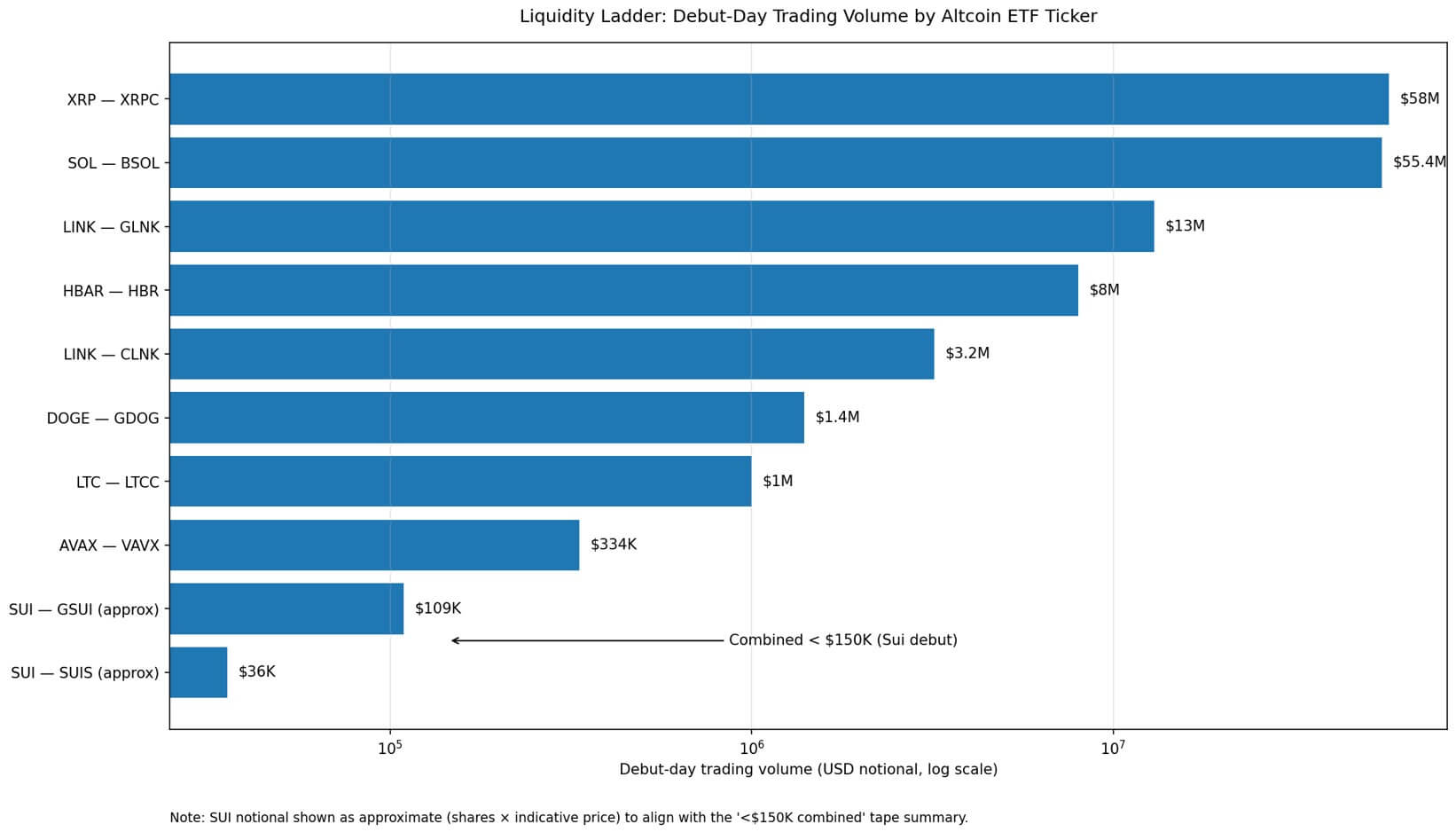 Обсяг торгів альткоїнів ETF у перший день коливався від 58 мільйонів доларів для XRP до менш ніж 150 000 доларів для обох фондів Sui.## Sui навіть нижчий за цей «довгий хвіст»