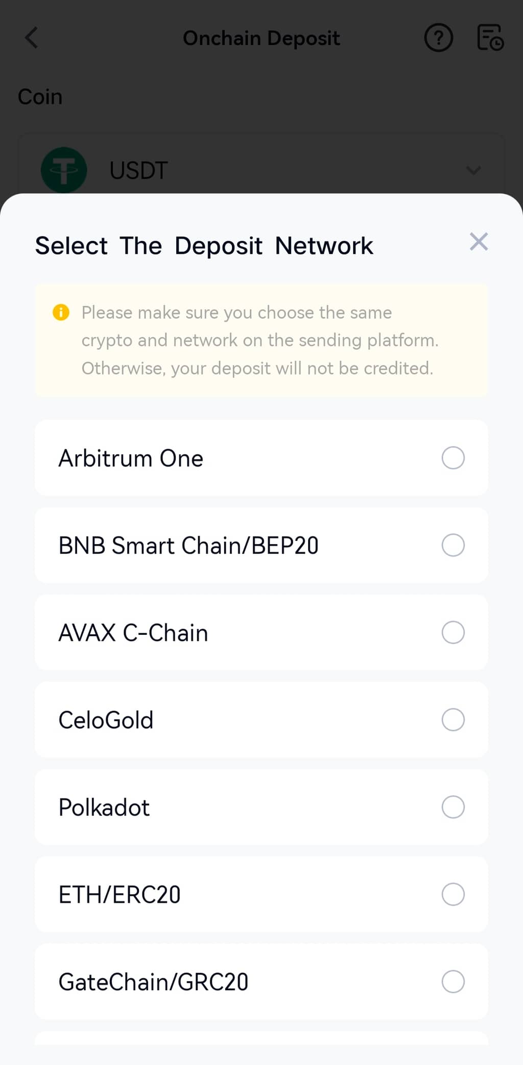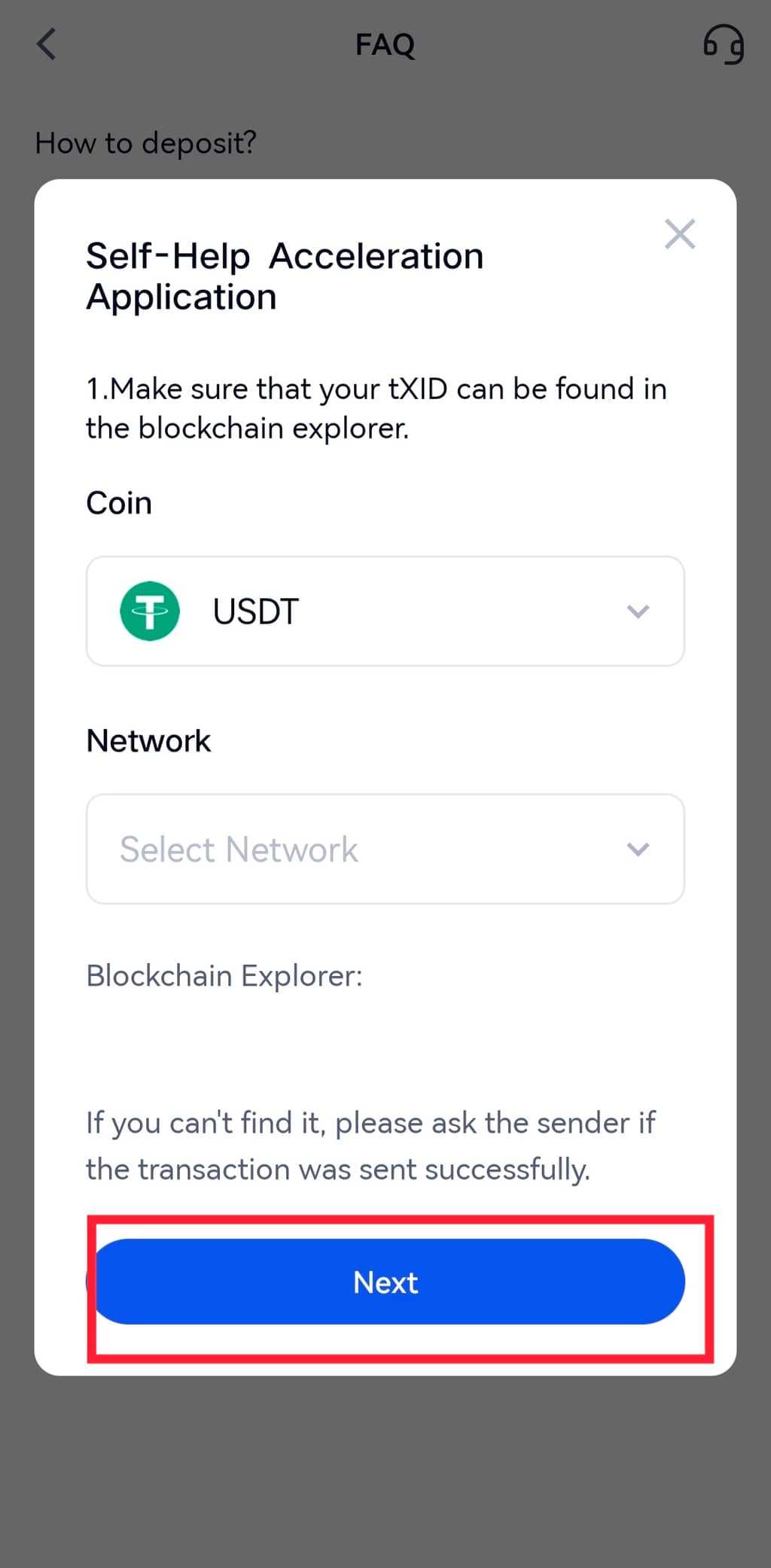 Chọn blockchain mà bạn sử dụng để nạp tiền và nhấn nút màu đỏ phía dưới để tiếp tục.