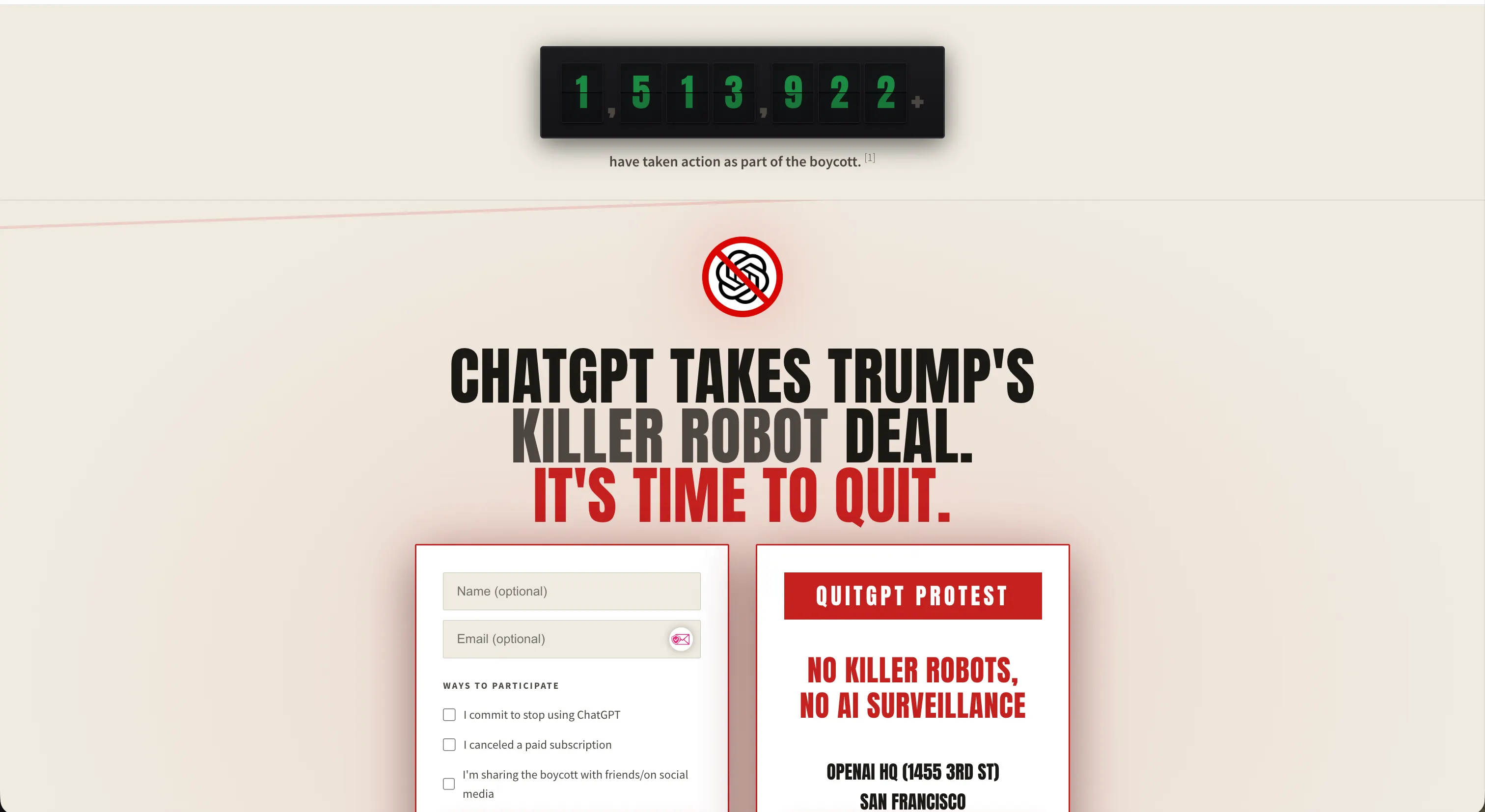 Phản ứng dữ dội ngay lập tức. Đến thứ Hai, phong trào “QuitGPT” tuyên bố hơn 1,5 triệu người đã hành động—hủy đăng ký, chia sẻ bài đăng tẩy chay, hoặc đăng ký tại quitgpt.org.