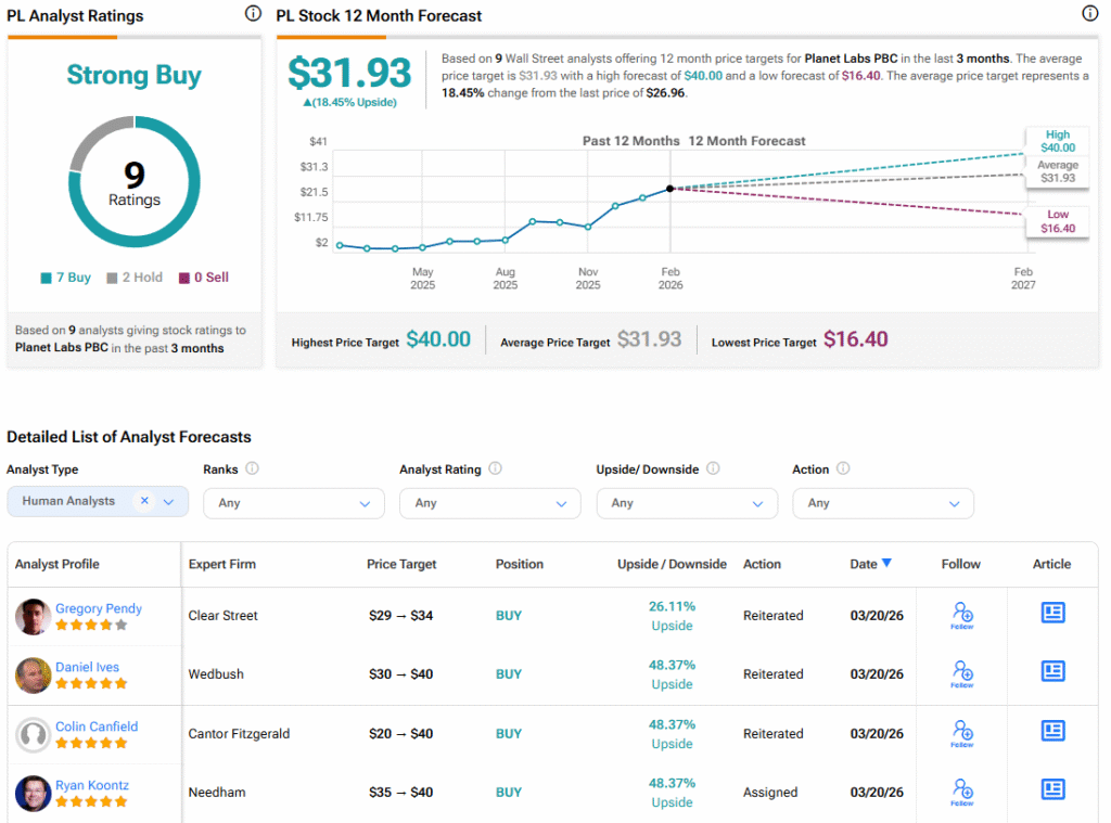 Theo các nhà phân tích Phố Wall, xếp hạng đồng thuận dành cho Planet Labs PBC là Mua mạnh, dựa trên bảy đánh giá Mua và hai đánh giá Giữ trong ba tháng qua. Trung bình mục tiêu giá PL là 31,93 USD, tiềm năng tăng giá khoảng 18,45%. Các xếp hạng và mục tiêu giá này có thể thay đổi khi các nhà phân tích cập nhật dự báo sau báo cáo lợi nhuận hôm nay.