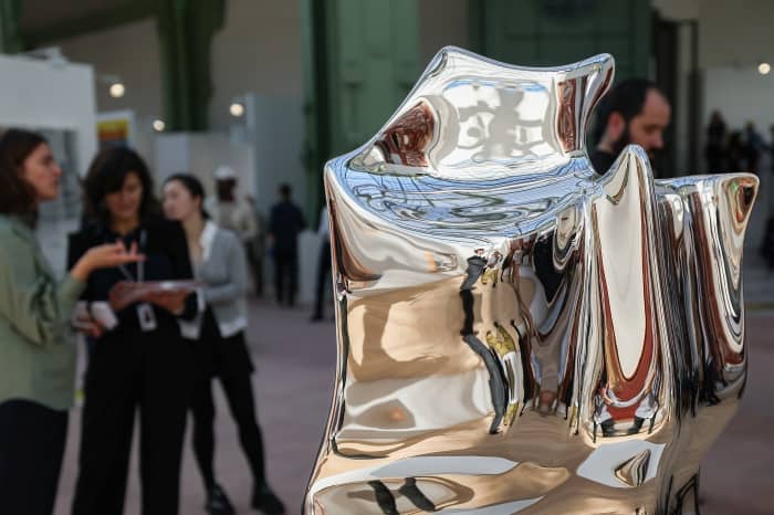 Khách tham quan được phản ánh trong một tác phẩm nghệ thuật không có tiêu đề của nhà điêu khắc người Anh Tony Cragg trong Art Basel Paris tại Grand Palais ở Paris ngày 16 tháng 10.