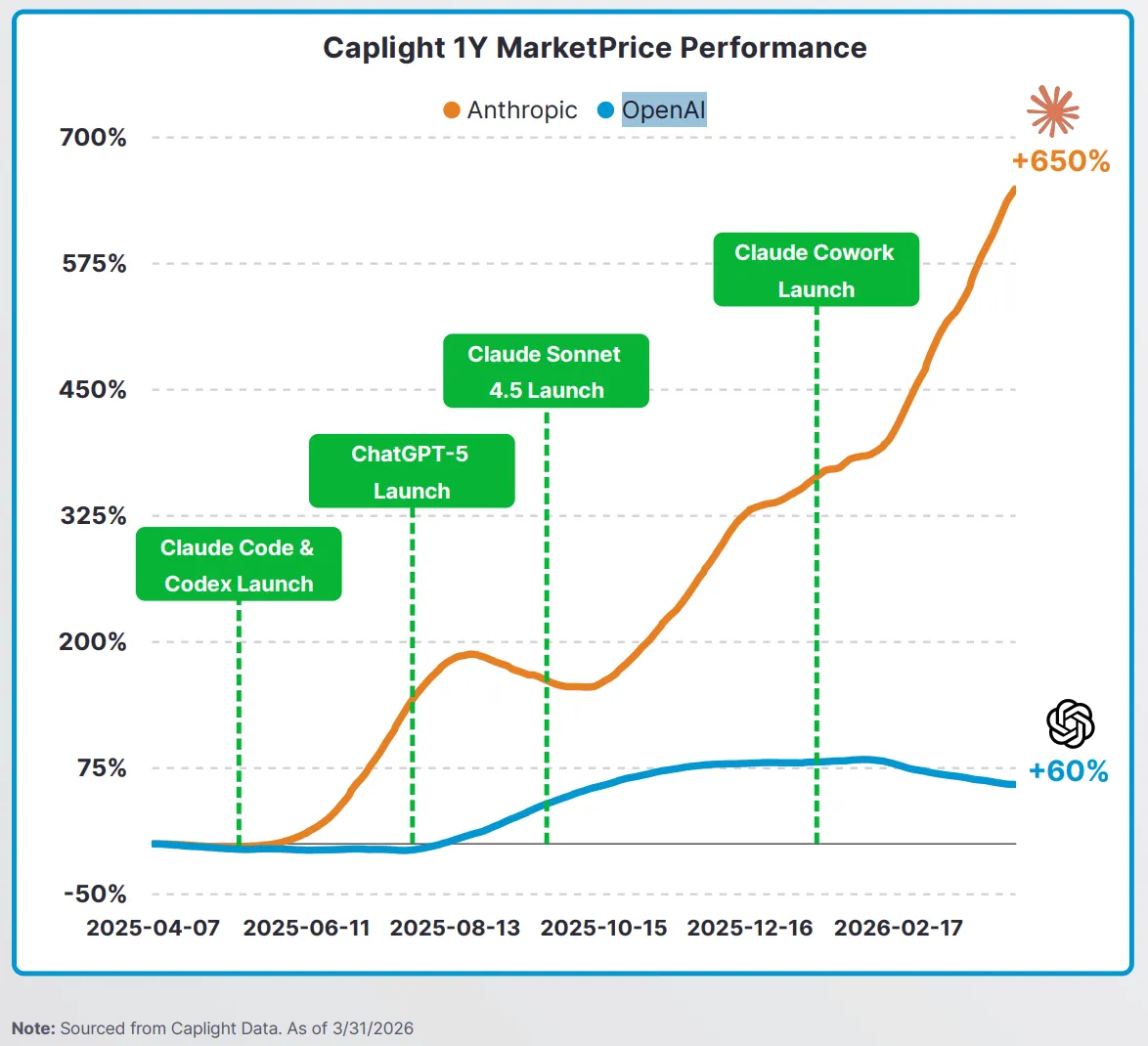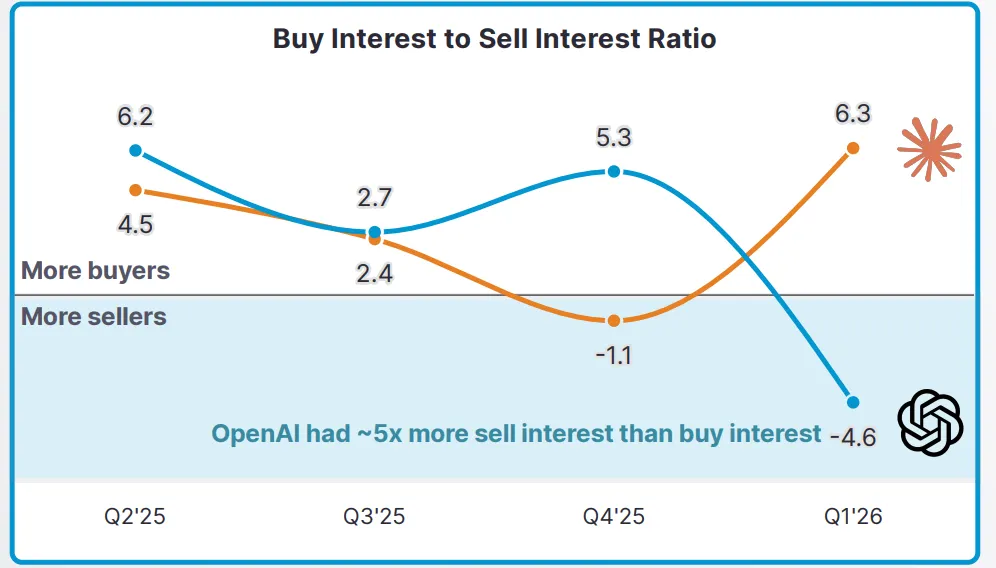 Ngoài doanh thu, phía cung đang làm phần lớn công việc đẩy giá trị này lên cao. Nhân viên và các nhà đầu tư sớm của Anthropic ít có cơ hội bán ra. Khi người mua đổ vào và hầu như không ai bán, giá sẽ tăng nhanh. Glen Anderson của Rainmaker Securities nói với Business Insider rằng một định giá $960 tỷ—mà cách đây một tháng còn “không thể nghĩ tới”—đang được các nhà mua cạnh tranh mua trong vòng vài giờ. Hình ảnh của OpenAI trông khác biệt. Trên Forge Global, OpenAI đang giao dịch ở mức $880 tỷ—chỉ cao hơn 3% so với định giá $852 tỷ trong vòng gọi vốn đầu năm 2026. Caplight phát hiện rằng trong quý 1, công ty của Sam Altman đã báo cáo có nhiều người quan tâm bán hơn mua trên thị trường thứ cấp.
