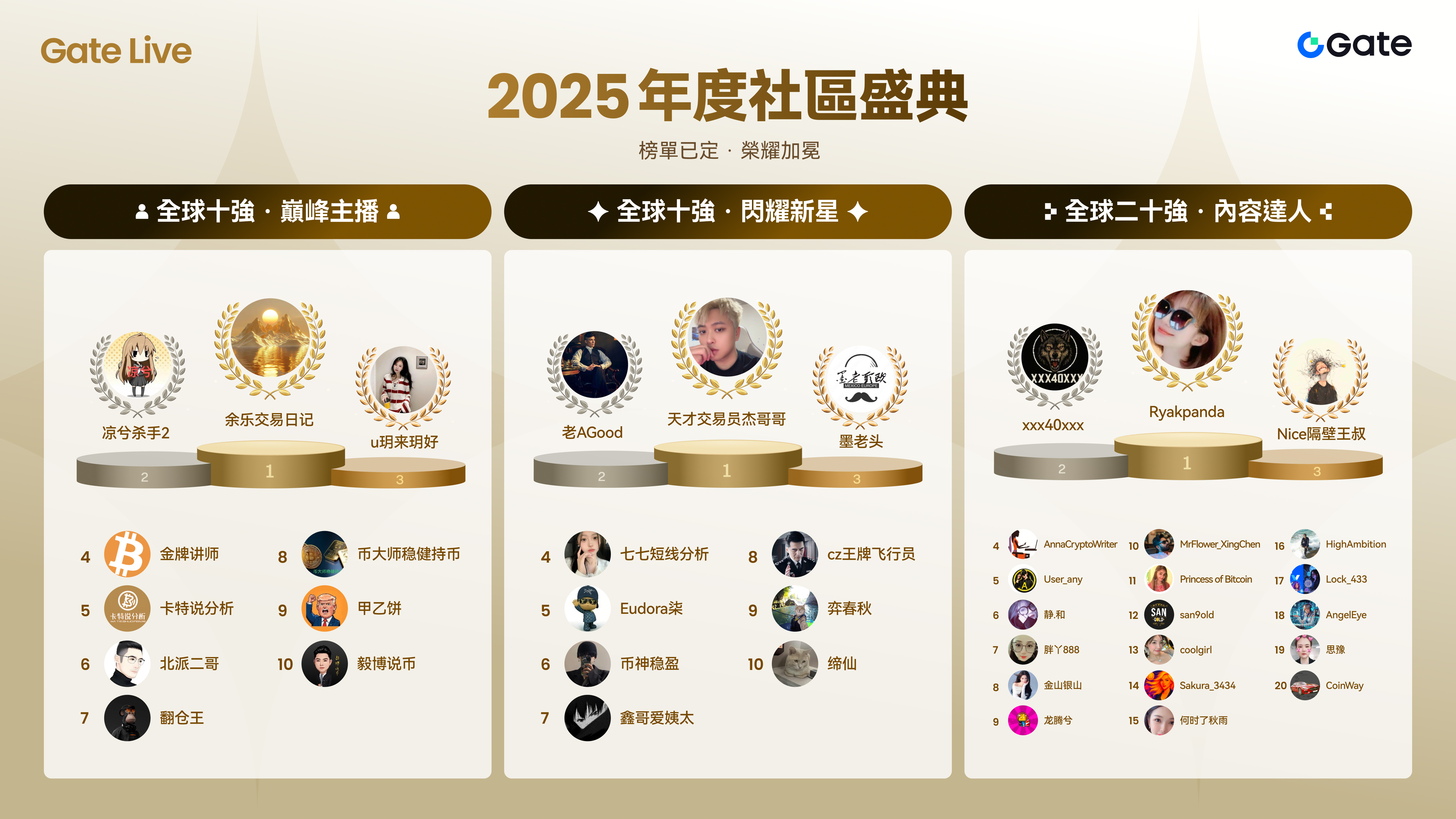 Gate 於 1 月 27 日正式公布 2025 年終社區盛典巔峰主播與內容達人榜單。本次榜單基於平台數據與社區表現綜合評選,旨在表彰在直播內容創作與社區影響力方面表現突出的創作者。