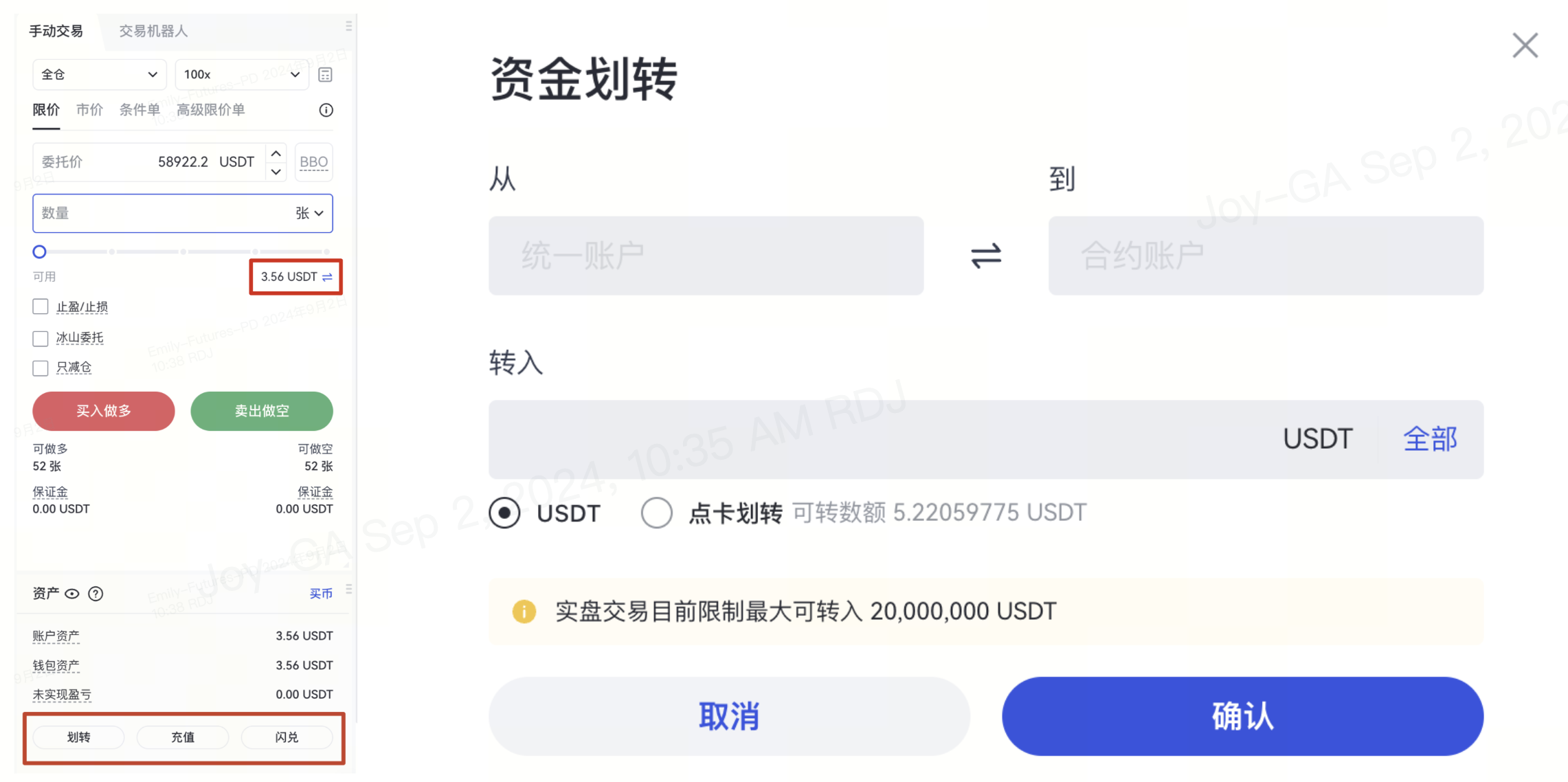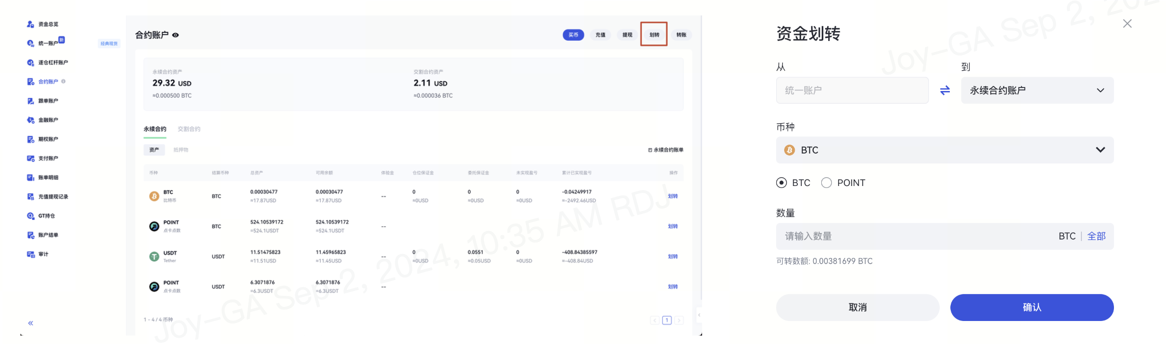 選擇劃轉的方向、保證金幣種,輸入劃轉金額,然後點擊確定即可。