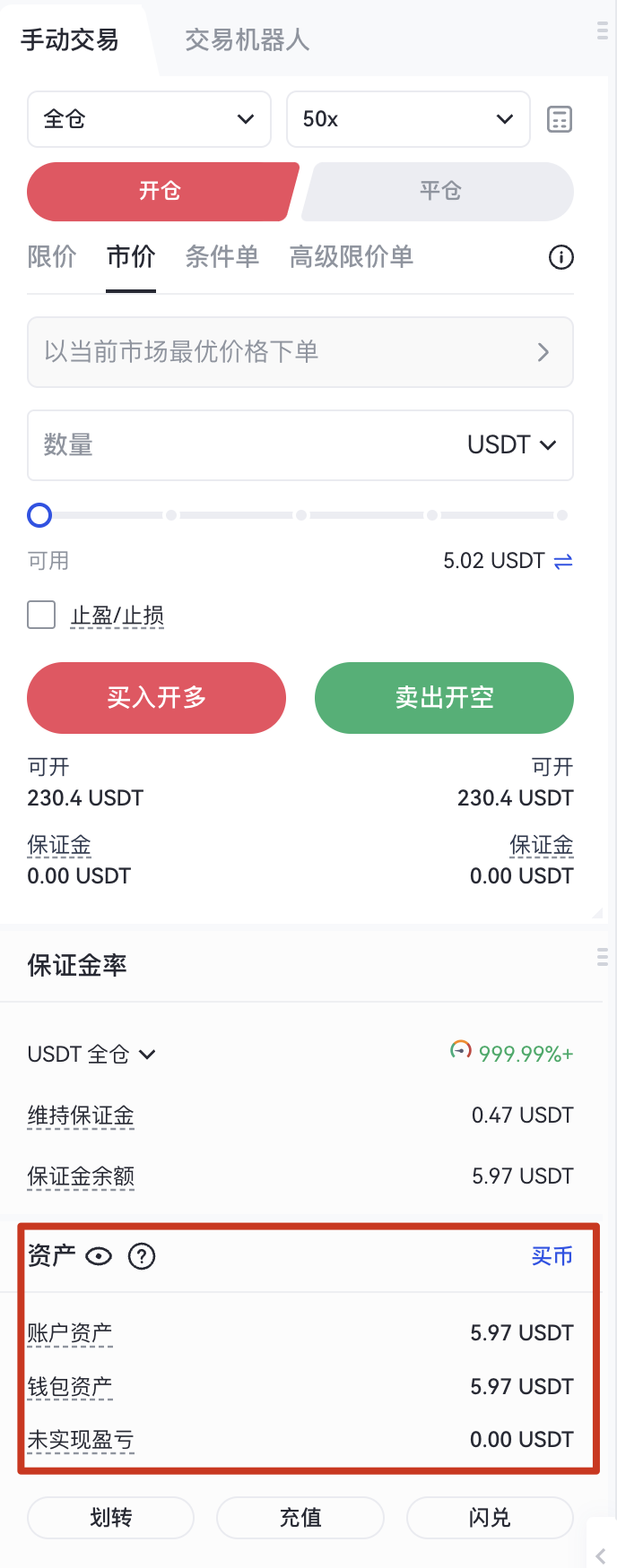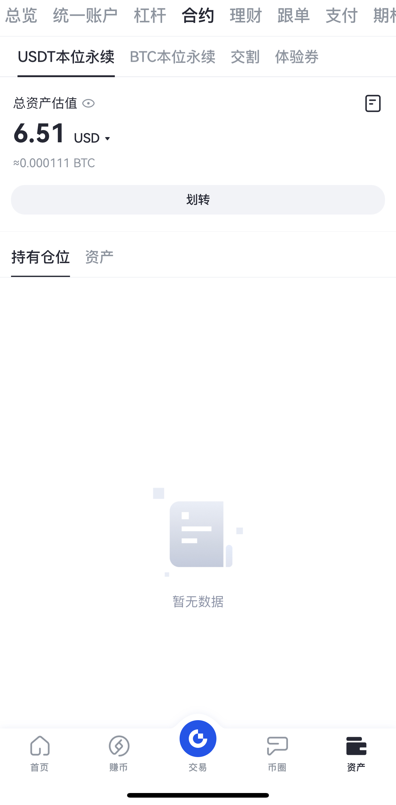 在合約交易界面的“可用”處直接查看,或者在“資產”內查看當前合約賬戶餘額。