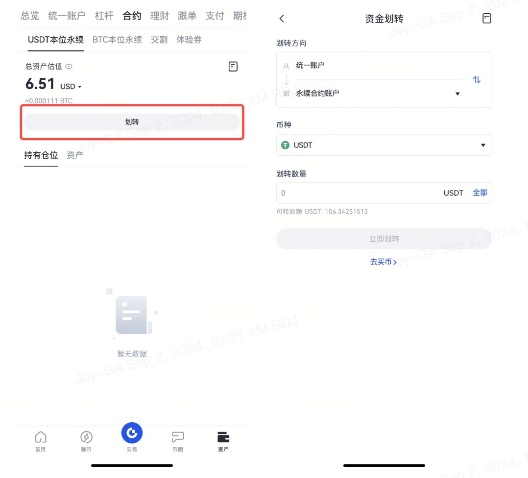 2. 也可以在右上角導航欄“資產”界面劃轉您的資金。 操作步驟:資產 > 合約賬戶 > 劃轉 。