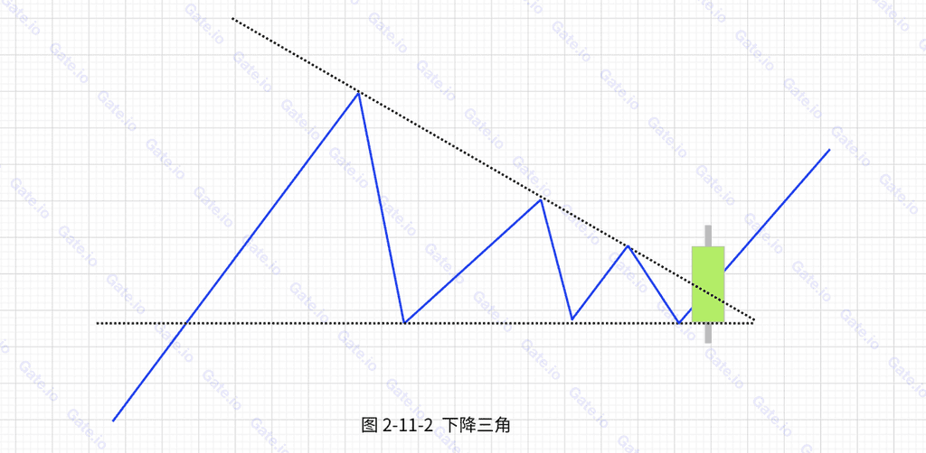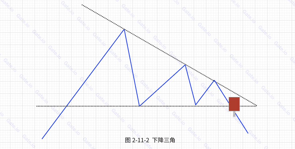 下降三角形的情形和上升三角形恰好相反。幣價下跌一段時間之後,在某個特定的價位區域上出現穩定的購買力,價格每次回落至該水平就止跌回升,連接每一個低點就形成一條水平的直線。