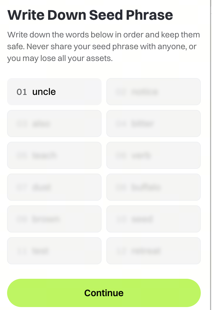 實際操作時,私鑰通常不會以一長串複雜字元呈現,而是以更便於記錄的「助記詞(Mnemonic Phrase)」形式出現。