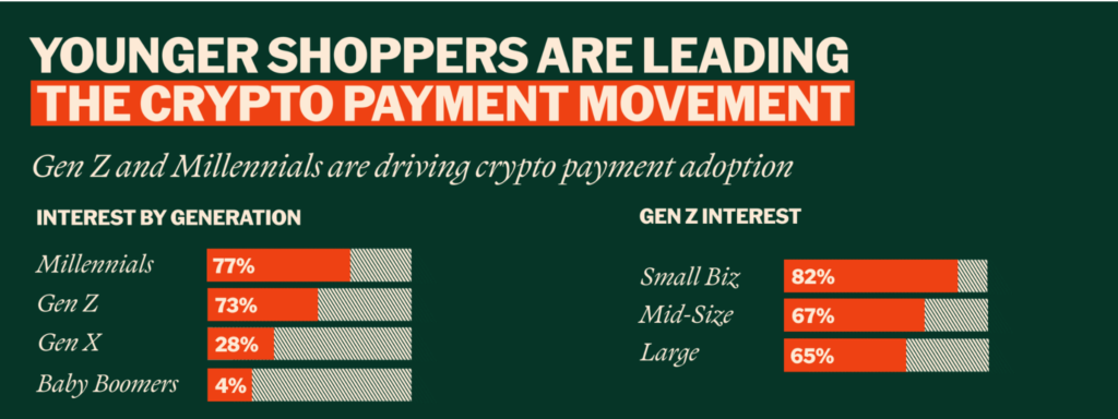數據很誠實:88% 的商家表示收過客戶詢問「能不能用加密幣付錢」,其中 69% 甚至每個月都被問至少一次。這背後的推手是千禧世代和 Z 世代,對他們來說,錢包裡的 USDC 或 ETH 是流動資金,不是鎖在保險箱的金條。