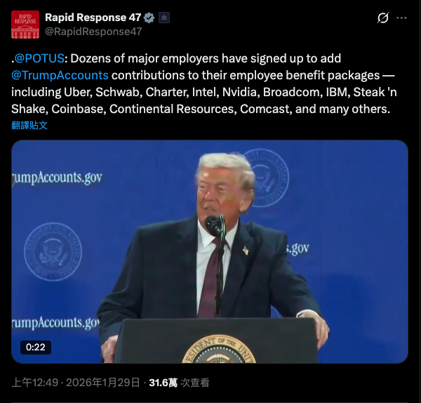 川普也在昨日的活動中宣布,已有數十家大型企業將此納入員工福利,包括英特爾(Intel)、輝達(Nvidia)、博通(Broadcom)、IBM 以及康卡斯特(Comcast)、加密貨幣交易所 Coinbase 等公司均承諾,若員工子女符合資格,公司將比照政府金額,額外提撥 1,000 美元存入帳戶。