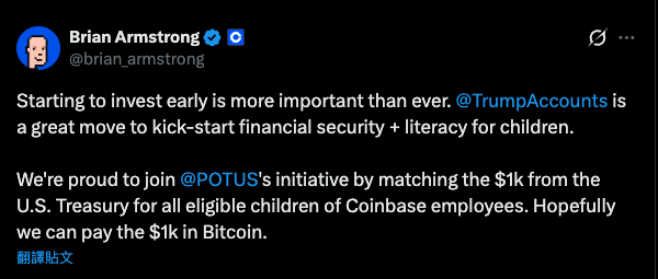 加密貨幣交易所 Coinbase 也加入行列,執行長 Brian Armstrong 表示,將為符合條件的員工子女提供 1,000 美元配對金,並希望能以比特幣的形式支付這筆款項。