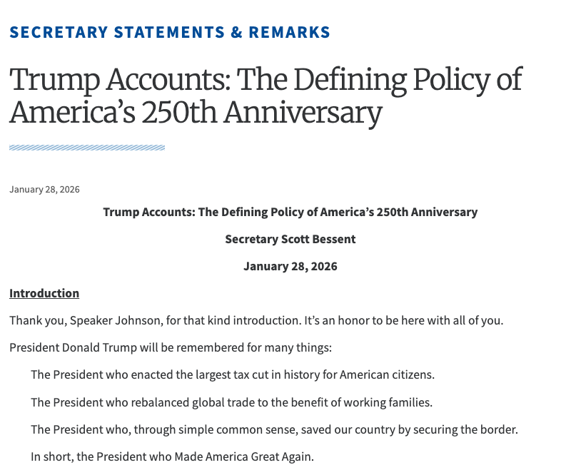 圖源:美國財政部 美國財政部正式宣布啟動川普帳戶(Trump Accounts)計畫,目標是讓每一位美國公民成為國家經濟成長的股東。