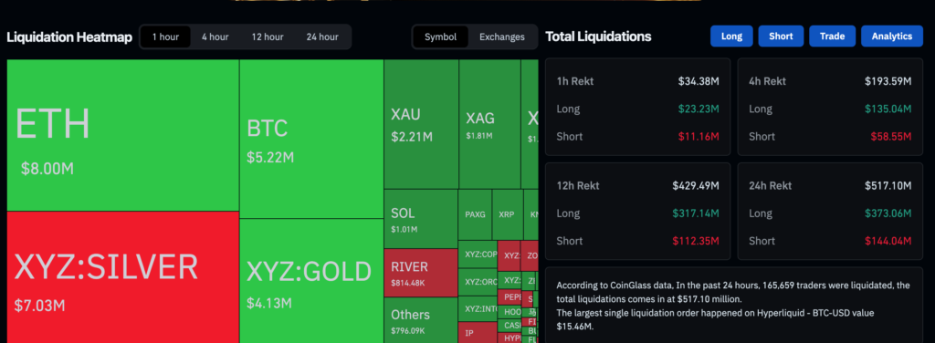 根據 Coinglass 數據,過去 24 小時造成超過5.1億美元的爆倉,其中最大虧損在於Hyperliquid 的看多部位,損失達1.28億美元,顯示市場仍有許多交易員認為是底部已到做多,但回調無法突破 78000美元水位而回落。