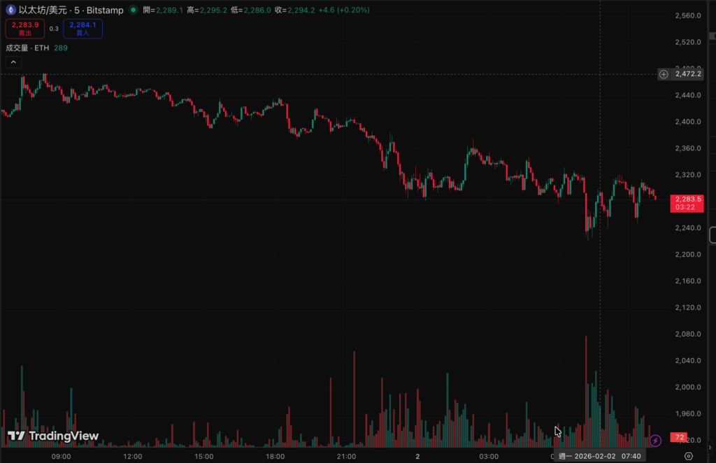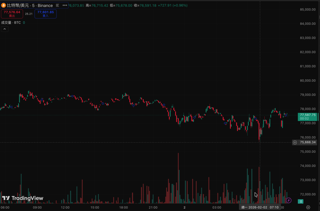 今(1)日幣價持續低迷,比特幣清晨暴跌至 75,678 美元,接近昨日的 2025 年 4 月以來的最低點,週一早晨短暫回升78000美元水位後,現價回落77587美元水位,,過去 24 小時跌幅收斂到 5.7%;以太坊則是從做日晚間的2400美元水位,下探到最低2219美元,現報價為2289.7美元。