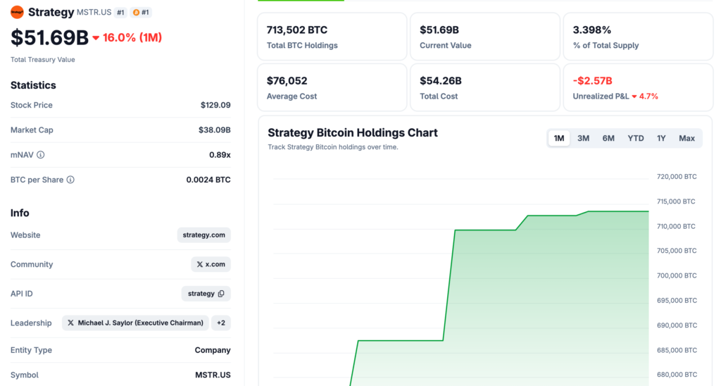 對全球最大比特幣機構持有者 Strategy(微策略)而言,近期的這場加密嚴冬也讓其開始感到刺骨的寒意。根據 Coingecko 數據,該公司當前共持有 713,502 枚 BTC,由於 BTC 今晨下殺 71,877 美元再度創下近期新低,讓 Strategy 面臨的壓力越來越大。