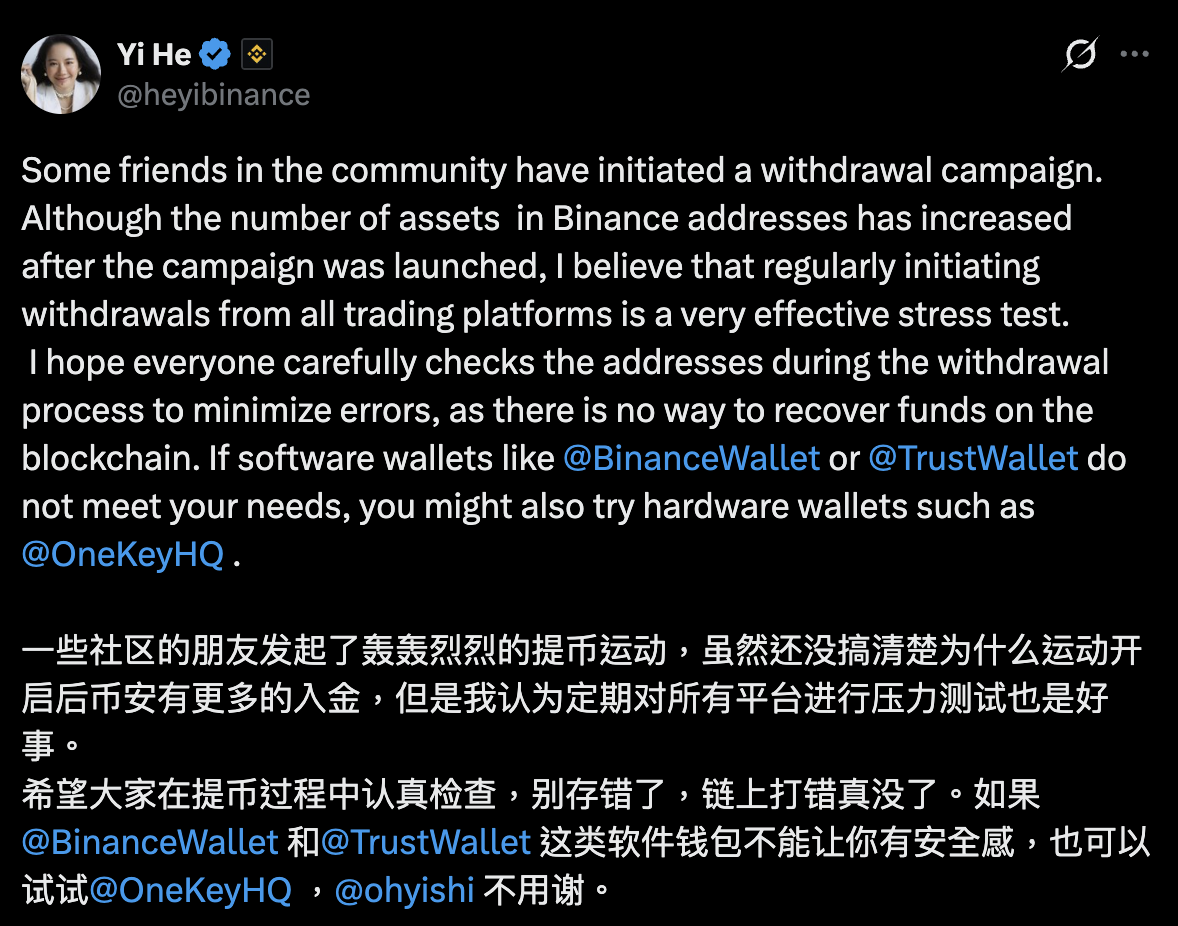 面對社群發起的「集體提幣運動」,幣安共同創辦人何一展現了大廠底氣。她表示:「一些社群朋友發起了轟轟烈烈的提幣運動,雖然還沒搞清楚為什麼運動開啟後幣安有更多的入金,但是我認為定期對所有平台進行壓力測試也是好事。」