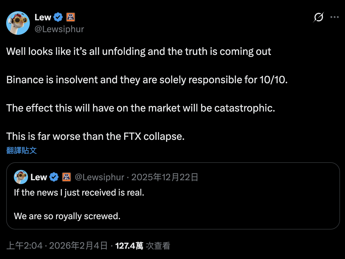 事件起於周三,X 用戶 Lewsiphur 發文指出「幣安資不抵債」,並警告說幣安若破產,對市場造成的衝擊將「遠比 FTX 倒閉更具毀滅性」。
