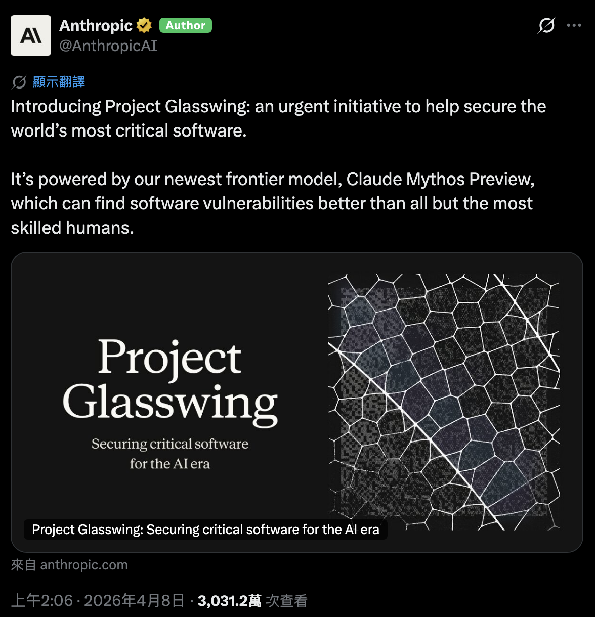 圖源:X/@AnthropicAI Anthropic 同步宣佈啟動名為「玻璃翼計劃」(Project Glasswing)的防禦性網路安全合作計劃