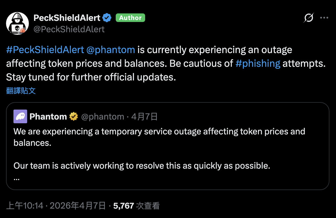 空投期間突發故障,價格與餘額顯示異常 Solana 生態熱門錢包 Phantom 於週一晚間突發服務中斷,導致平台內多項代幣價格與帳戶餘額顯示異常。此次故障發生在熱門空投活動期間,交易需求大幅提升,使問題迅速擴大。 官方表示,此次異常主要影響前端資料更新,導致使用者無法即時查看正確資產數值,甚至出現價格暴跌或資產歸零的顯示情況。儘管 Phantom 強調「使用者資產安全未受影響」,但錯誤資訊已對市場行為產生實質干擾。