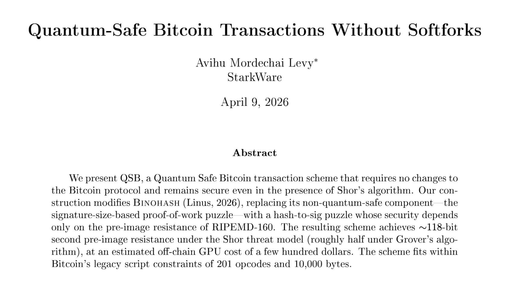 除了錢包救援工具,StarkWare 開發者 Avihu Levy 同樣於昨(4/9)日提出了名為「量子安全比特幣」(Quantum Safe Bitcoin,簡稱 QSB)的研究。