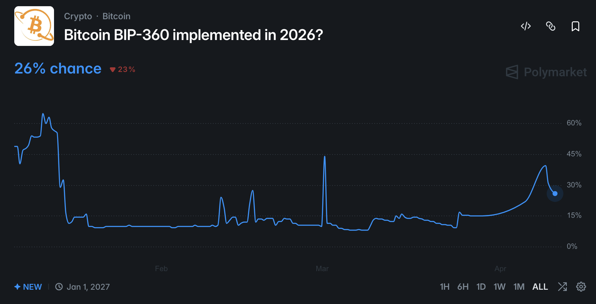 在預測平台 Polymarket 上,交易員認為比特幣量子抗性升級提案(如 BIP-360)在 2027 年前被採納的機率落在 26%。雖然學術界對於大規模量子攻擊的發生時間點仍有爭論,但近期出現的這些救援工具與交易提案,大幅提升了網路應對未來風險的韌性。