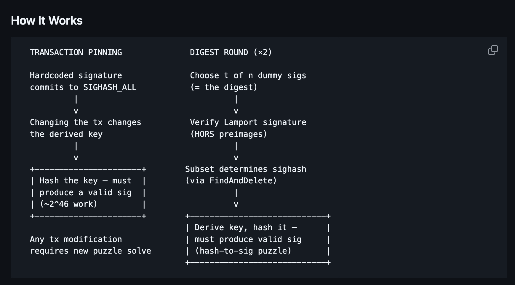QSB 透過在比特幣現有的腳本限制內嵌入「雜湊轉簽章」謎題,利用 RIPEMD-160 等函數構造出一種驗證機制。使用者需要尋找特定的交易參數以滿足雜湊證明條件,這種類似於微型工作量證明的過程,成功機率約為 70.4 兆分之一。