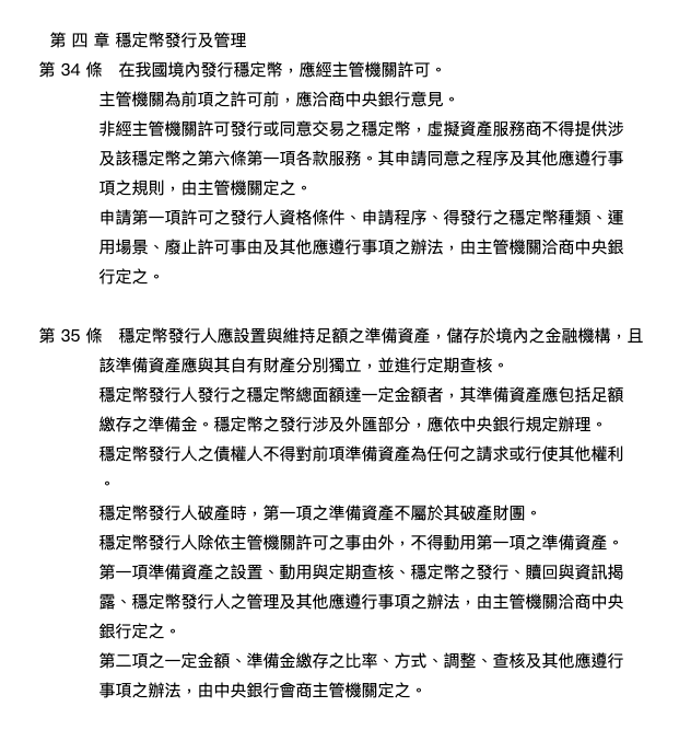 金管會在 2025 年 3 月公開的草案版本中,主要規定穩定幣發行人必須獲得許可才能發行,可獲的許可的條件包含維持與自有財產獨立的準備資產等,並定期查核。
